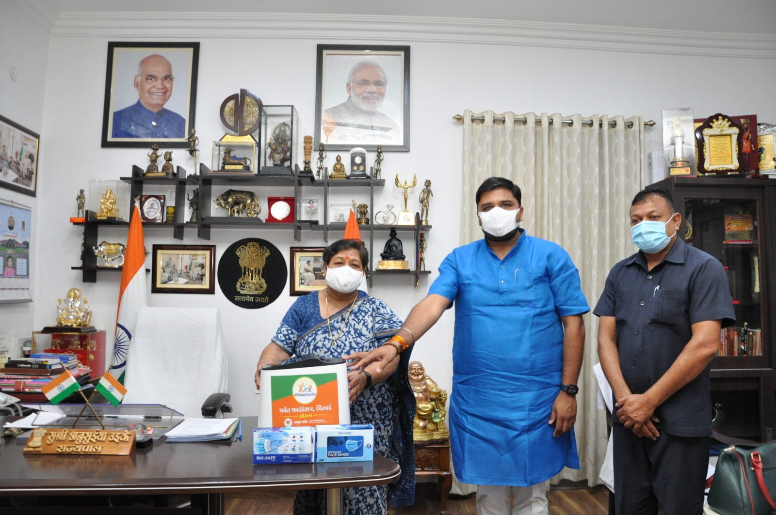 राज्यपाल सुश्री अनुसुईया उइके को आज राजभवन में भिलाई केन डू पर्वत फाऊण्डेंशन के प्रमुख श्री अतुल पर्वत ने राजभवन के कर्मचारियों के लिए ऑक्सीजन कन्सनट्रेटर मशीन और मास्क प्रदान किए। उन्होंने राज्यपाल को कोरोना काल में उनके द्वारा किए गए कल्याणकारी कार्यो की जानकारी दी। राज्यपाल ने उन्हें धन्यवाद दिया और कहा कि इस त्रासदी के समय आपके और आपके संस्था के द्वारा जो मानवीय कार्य किया गया है वह सराहनीय है। ऐसे कार्यों से समाज को प्रेरणा मिलती है। श्री पर्वत ने बताया कि उनके द्वारा गत वर्ष 1100 परिवारों को भोजन वितरण किया गया और पुलिसकर्मियों को सहायता प्रदान की गई। साथ ही रायपुर और भिलाई में मास्क वितरण किए गए। उन्होंने बताया कि उनके द्वारा पुलिस स्टेशन में सेनिटाइजर मशीन वितरित किए गए।