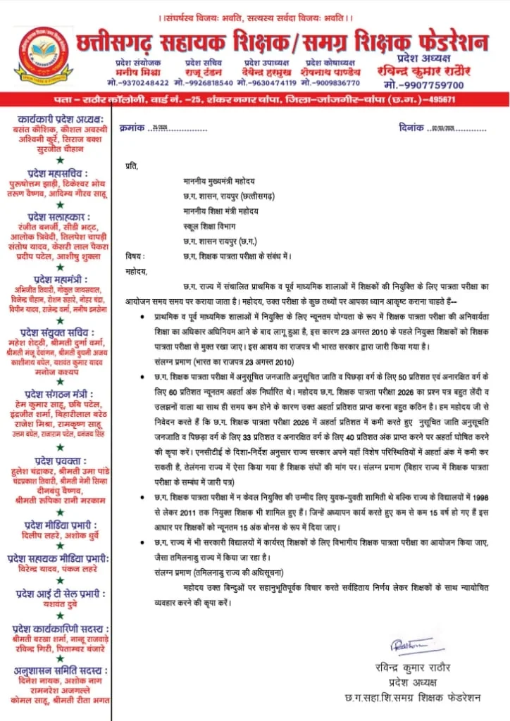 रायपुर। छत्तीसगढ़ में सहायक शिक्षक समग्र शिक्षक फेडरेशन ने राज्य के मुख्यमंत्री और शिक्षा मंत्री को एक कड़ा पत्र लिखकर शिक्षक पात्रता परीक्षा (TET) 2026 की विसंगतियों पर सवाल उठाए हैं। फेडरेशन के अध्यक्ष रविंद्र राठौर ने स्पष्ट किया है कि यदि सरकार ने कट-ऑफ अंकों और पुराने शिक्षकों की नियुक्ति शर्तों में बदलाव नहीं किया, तो हजारों अनुभवी शिक्षकों का भविष्य अधर में लटक जाएगा। यह मामला केवल एक परीक्षा का नहीं, बल्कि राज्य के 33 जिलों में कार्यरत उन गुरुजियों के सम्मान और सेवा सुरक्षा का है जो दशकों से बस्तर के अंदरूनी इलाकों से लेकर सरगुजा की पहाड़ियों तक शिक्षा की लौ जला रहे हैं।